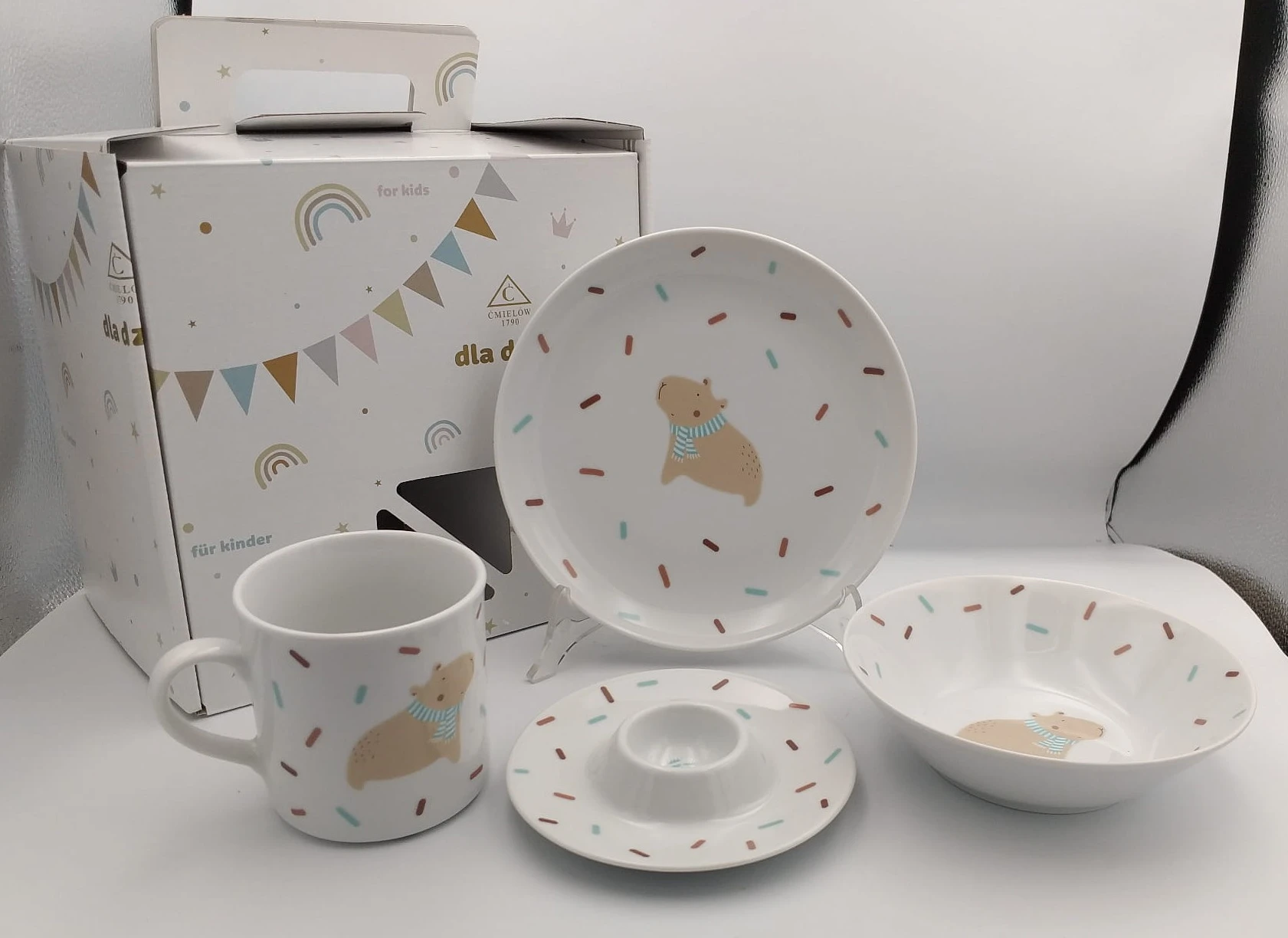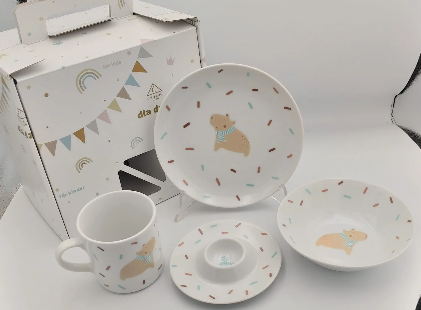 Zestaw dziecięcy dla 1 osoby 4 elementy W049 Uroczy zestaw porcelany z dekoracją przedstawiającą Kapibarę to idealny wybór dla najmłodszych! Naczynia zostały zaprojektowane z myślą o dzieciach – są lekkie, trwałe i bezpieczne w użytkowaniu. Wesoła dekoracja zachęca do samodzielnego jedzenia, czyniąc każdy posiłek prawdziwą przygodą. Skład zestawu: talerz płytki 18 cm 1 szt. salaterka okrągła 15 cm 1 szt. kubek 200 ml 1 szt. kieliszek do jaj z podstawką 1 szt.
