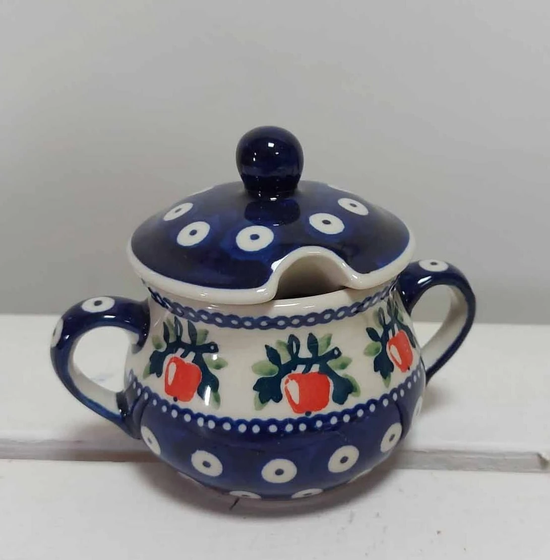 Klasyczna kobaltowa cukiernica . Nadaje się jako drobny upominek lub uzupełnienie każdej kolekcji ceramicznej i nie tylko. Idealnie pasująca do zestawu kawowo- herbacianego. Każda cukiernica wykonywana jest w całości ręcznie, przystosowana do kontaktu z żywnością. Produkt nadaję się do użycia w zmywarce. Wymiary: Długość 12,4 cm Szerokość 9 cm Wysokość 10 cm Pojemność: 0,18 l.