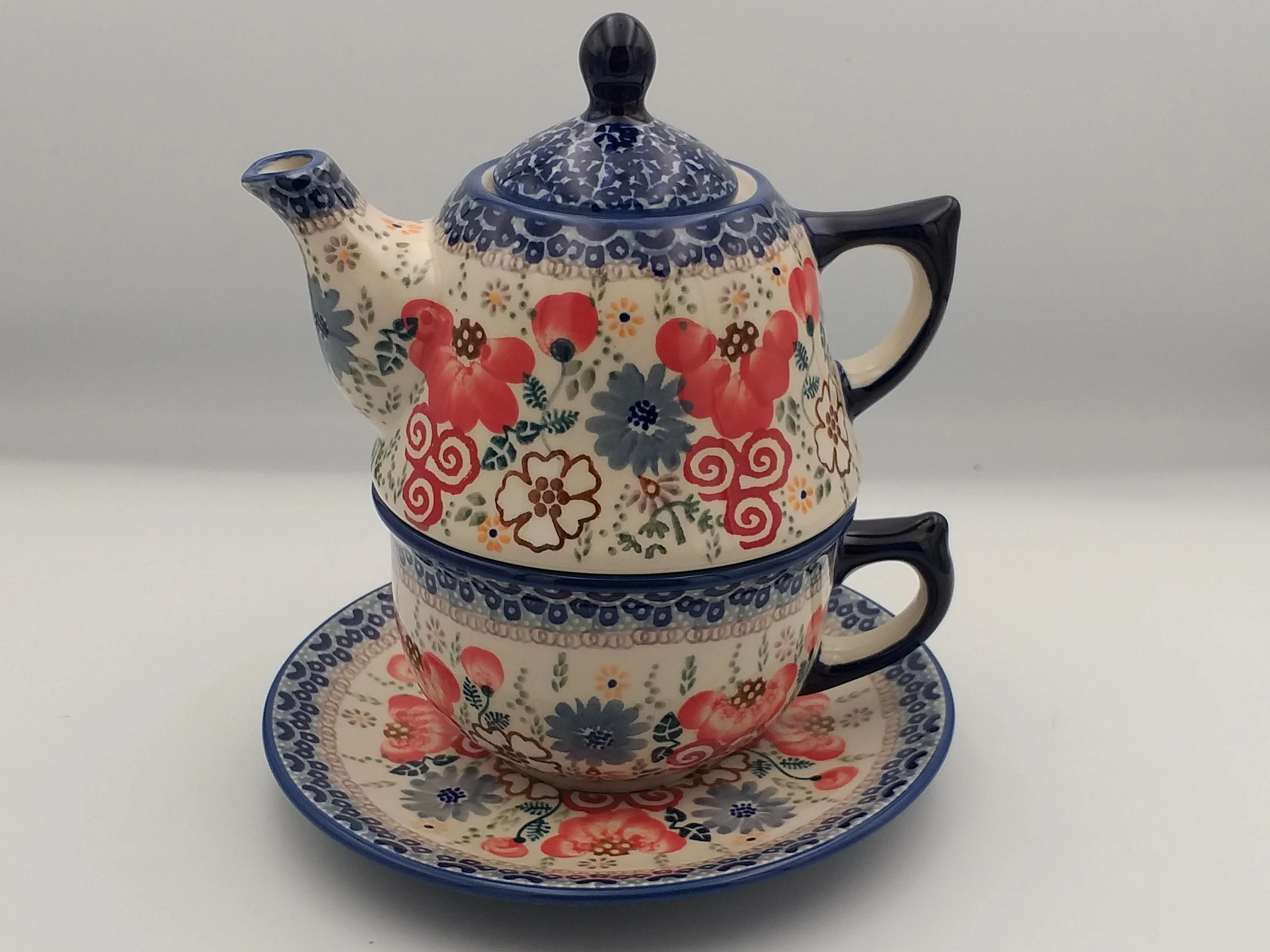 Zestaw składający się z czajniczka, dużej filiżanki oraz spodka to praktyczne rozwiązanie do serwowania herbaty lub kawy. Ceramika bolesławiecka jest trwała i odporna na wysokie temperatury, dzięki czemu sprawdzi się zarówno na co dzień, jak i jako element dekoracyjny.