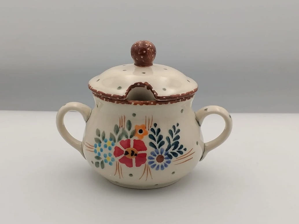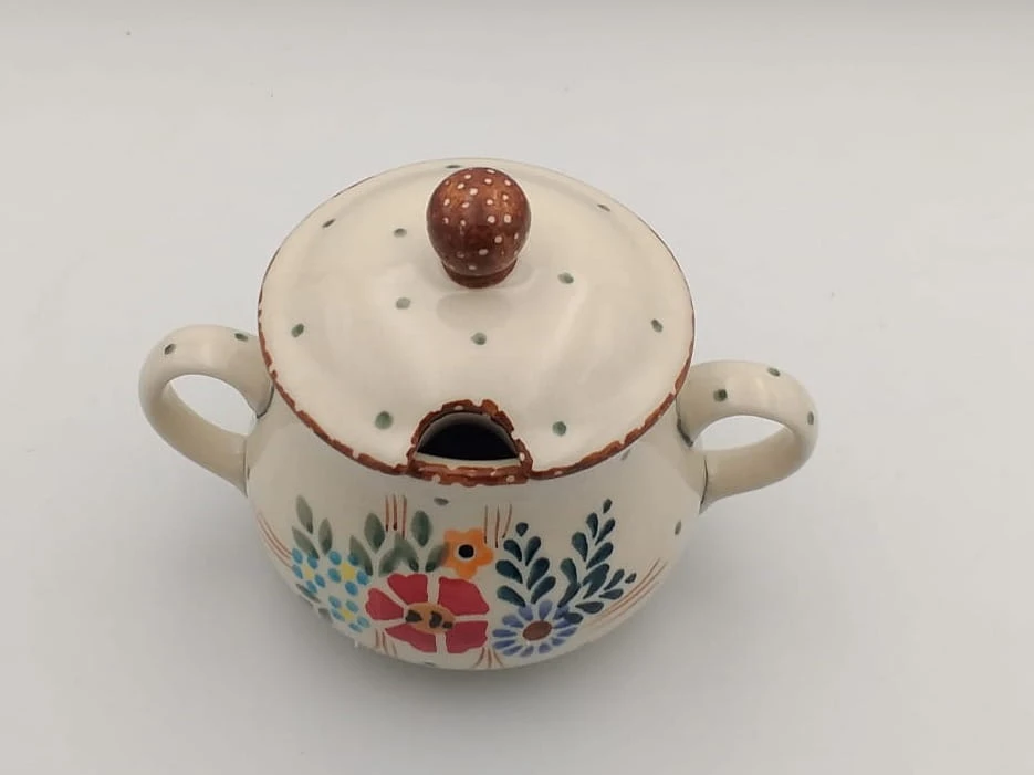 Klasyczna kobaltowa cukiernica . Nadaje się jako drobny upominek lub uzupełnienie każdej kolekcji ceramicznej i nie tylko. Idealnie pasująca do zestawu kawowo- herbacianego. Każda cukiernica wykonywana jest w całości ręcznie, przystosowana do kontaktu z żywnością. Produkt nadaję się do użycia w zmywarce. Wymiary: Długość 12,4 cm Szerokość 9 cm Wysokość 10 cm Pojemność: 0,18 l.