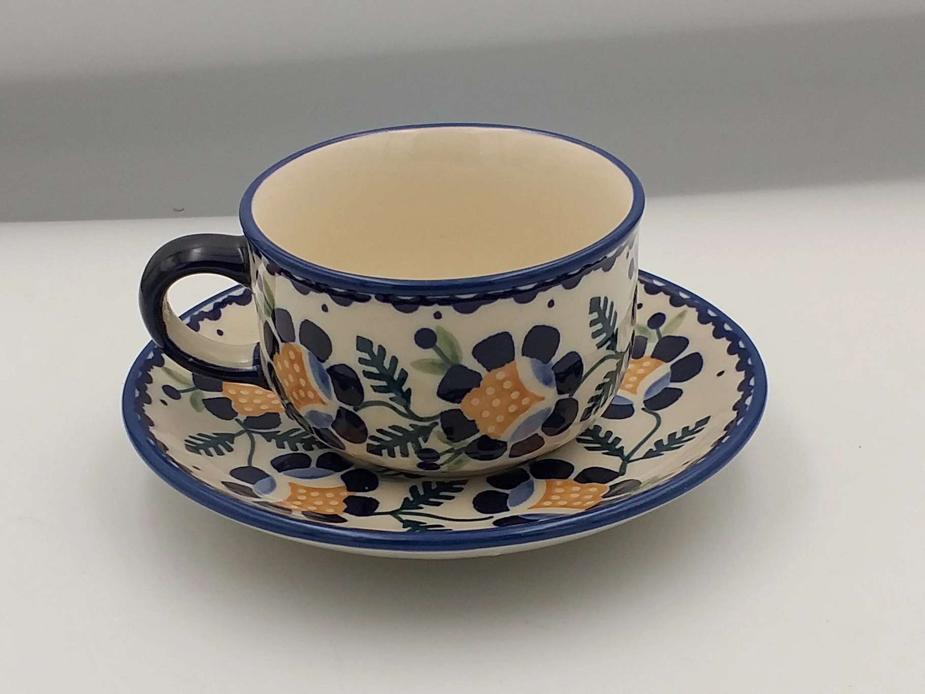 Filiżanka S ze spodkiem 0,15 l Bolesławiec to niewielki zestaw do serwowania kawy i herbaty.