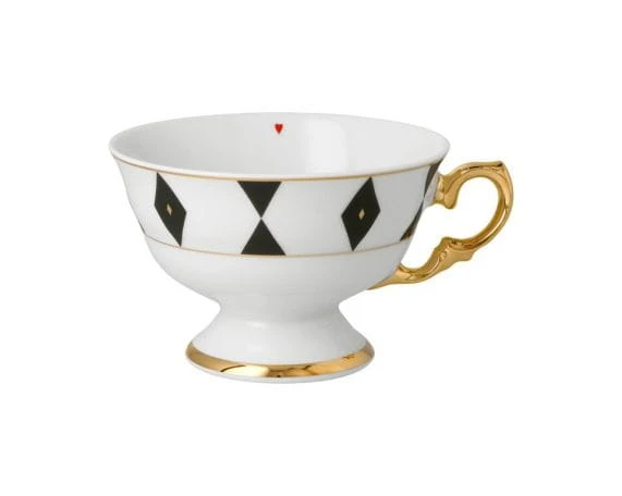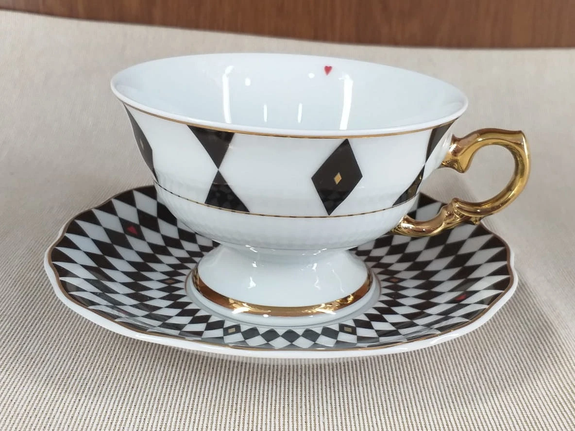 Niska filiżanka na nodze z kolekcji Alaska Dama Kier to doskonała propozycja dla miłośników wyrazistej i bogato zdobionej porcelany. Elegancki i stylowy deseń zachwyca czarnymi rombami i delikatnym serduszkiem. Wykończenia filiżanki ręcznie malowane złotem.