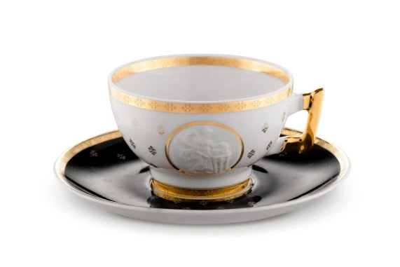 Dekoracja Atena nadaje filiżance wyrazisty, dekoracyjny charakter. Projekt inspirowany postacią bogini podkreśla kolekcjonerski styl zestawu.