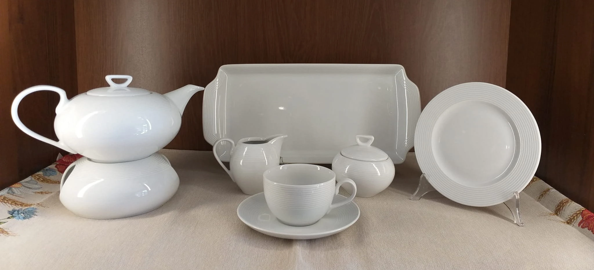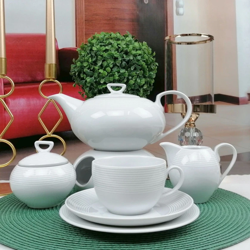 Zestaw zawiera filiżanki o pojemności 250 ml ze spodkami, talerzyki deserowe oraz elementy do serwowania herbaty, takie jak czajnik z podgrzewaczem, cukiernica, dzbanuszek i taca do ciasta. Podgrzewacz pozwala utrzymać temperaturę napoju przez dłuższy czas.