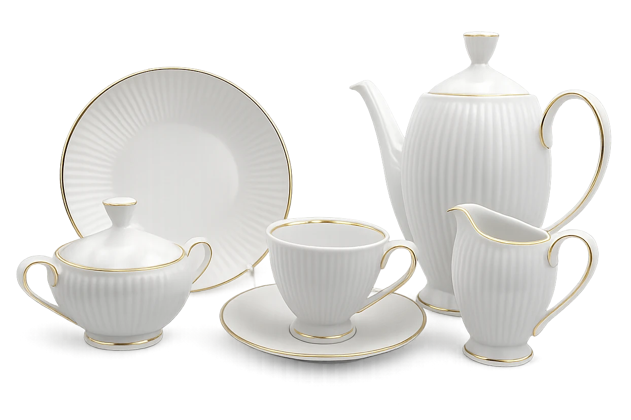 Zestaw zawiera filiżanki o pojemności 250 ml, spodki oraz większe talerzyki deserowe o średnicy 21 cm, a także imbryk, cukiernicę i dzbanek. Dzięki temu umożliwia wygodne serwowanie kawy oraz dodatków dla większej liczby gości.