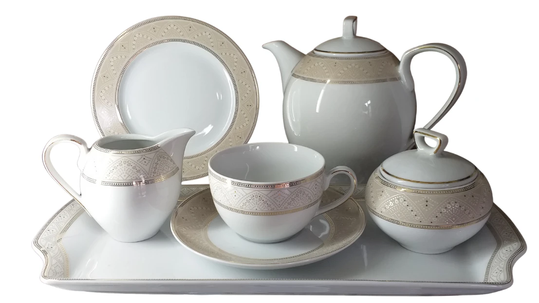 Zestaw zawiera filiżanki o pojemności 250 ml, spodki oraz talerzyki deserowe, a także imbryk, cukiernicę, dzbanek i prostokątną tackę. Dzięki temu umożliwia wygodne serwowanie kawy oraz dodatków dla większej liczby gości.