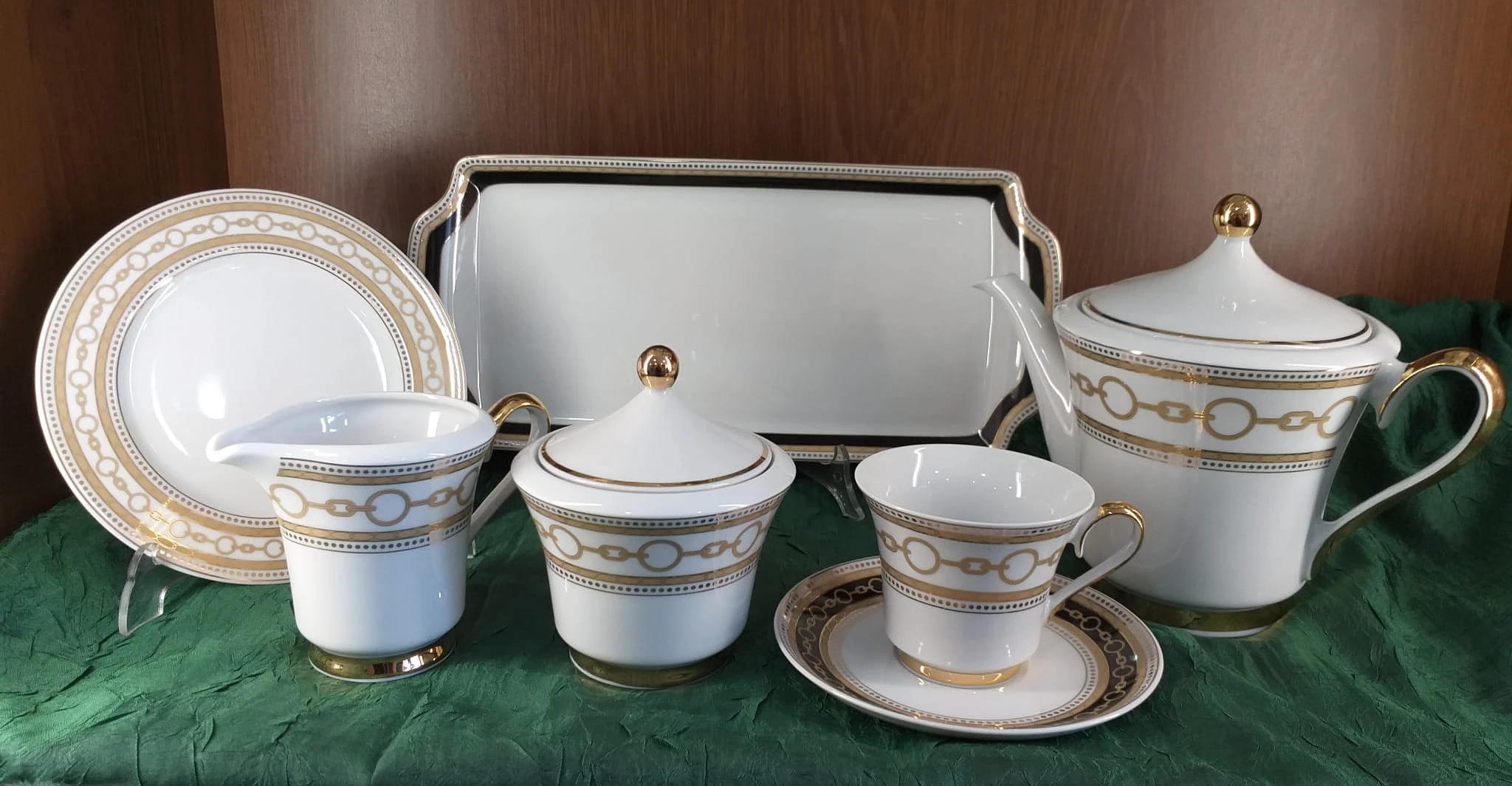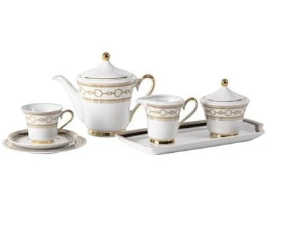 Zestaw zawiera filiżanki o pojemności 220 ml, spodki oraz talerzyki deserowe, a także czajnik, cukiernicę, dzbanek i prostokątną tackę. Dzięki temu umożliwia wygodne serwowanie kawy oraz dodatków podczas spotkań przy stole.