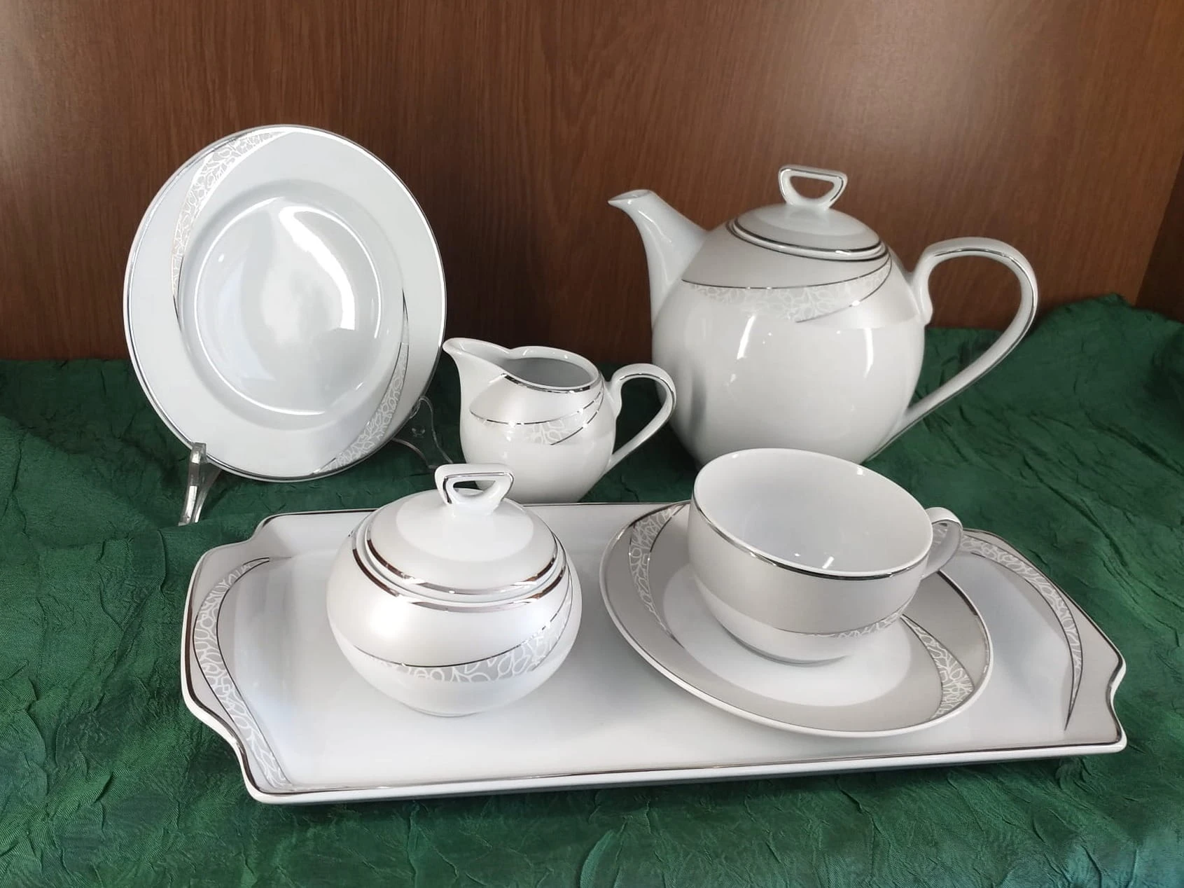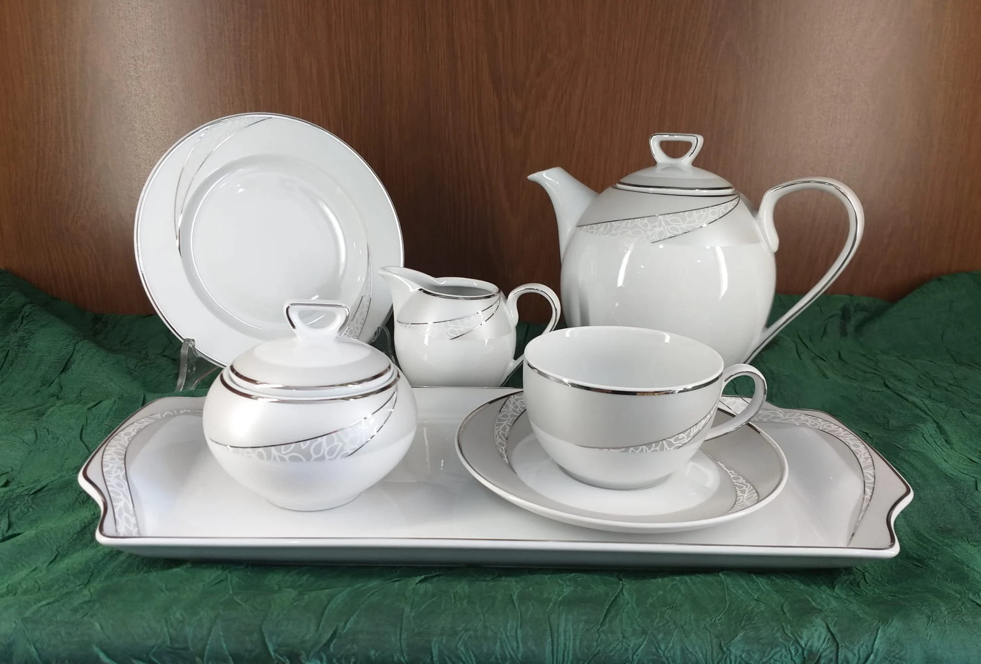 Zestaw zawiera filiżanki o pojemności 250 ml ze spodkami, talerzyki deserowe oraz elementy do serwowania kawy, takie jak imbryk, cukiernica, dzbanuszek i taca do ciasta. Dzięki temu umożliwia wygodne podanie kawy oraz dodatków dla większej liczby gości.