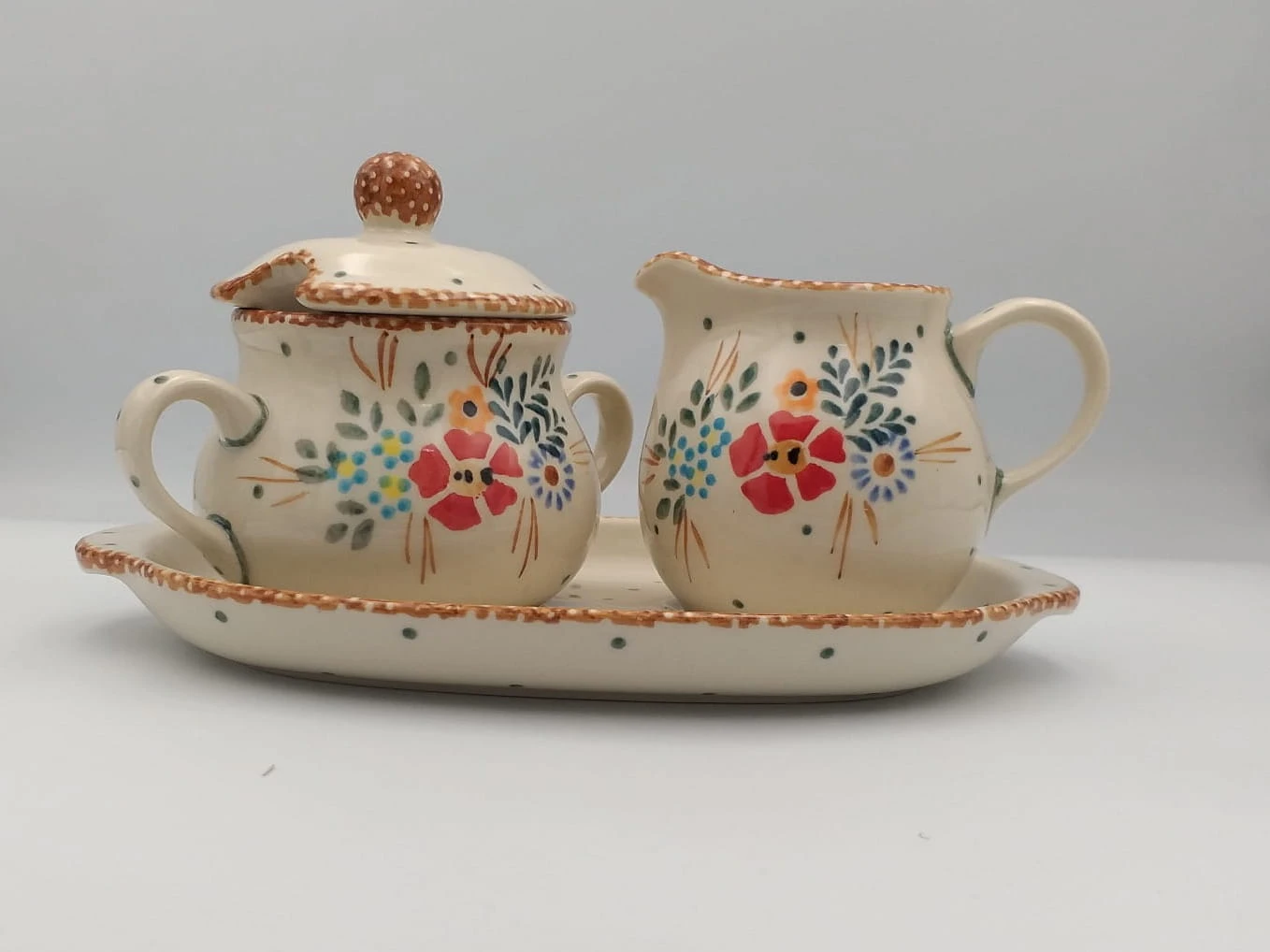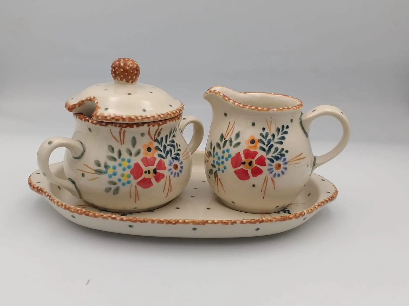 OPIS PRODUKTU Zestaw składający się z dzbanka na mleko i cukierniczki na tacce. Idealny jako upominek lub uzupełnienie kolekcji. Produkt malowany ręcznie, nadaje się do użytku w zmywarce, kuchence mikrofalowej