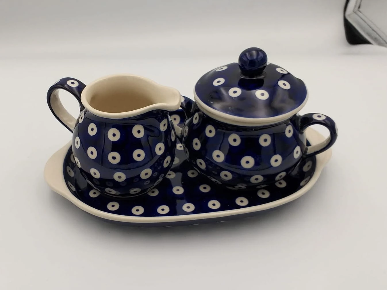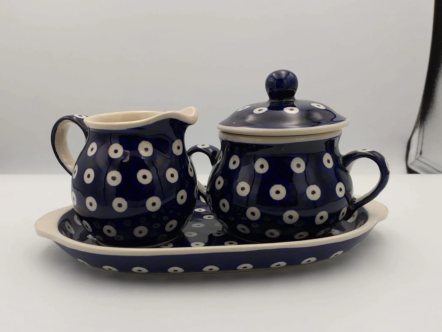 Zestaw składający się z dzbanka na mleko i cukierniczki na tacce. Idealny jako upominek lub uzupełnienie kolekcji. Produkt malowany ręcznie, nadaje się do użytku w zmywarce, kuchence mikrofalowej lub piekarniku.