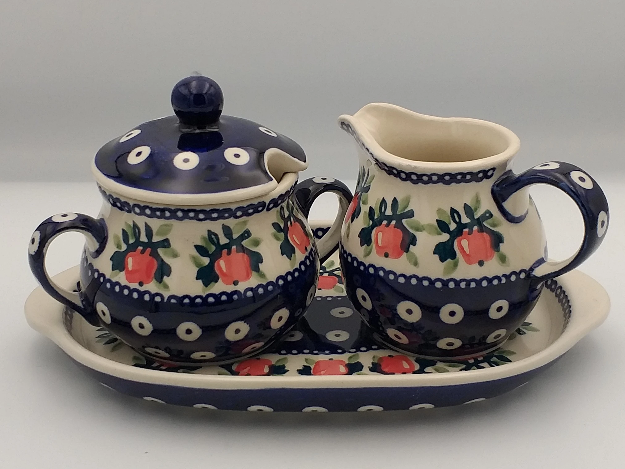 Zestaw Bolesławiec dzbanek na mleko i cukierniczka na tacce to praktyczny komplet do serwowania dodatków do kawy i herbaty.