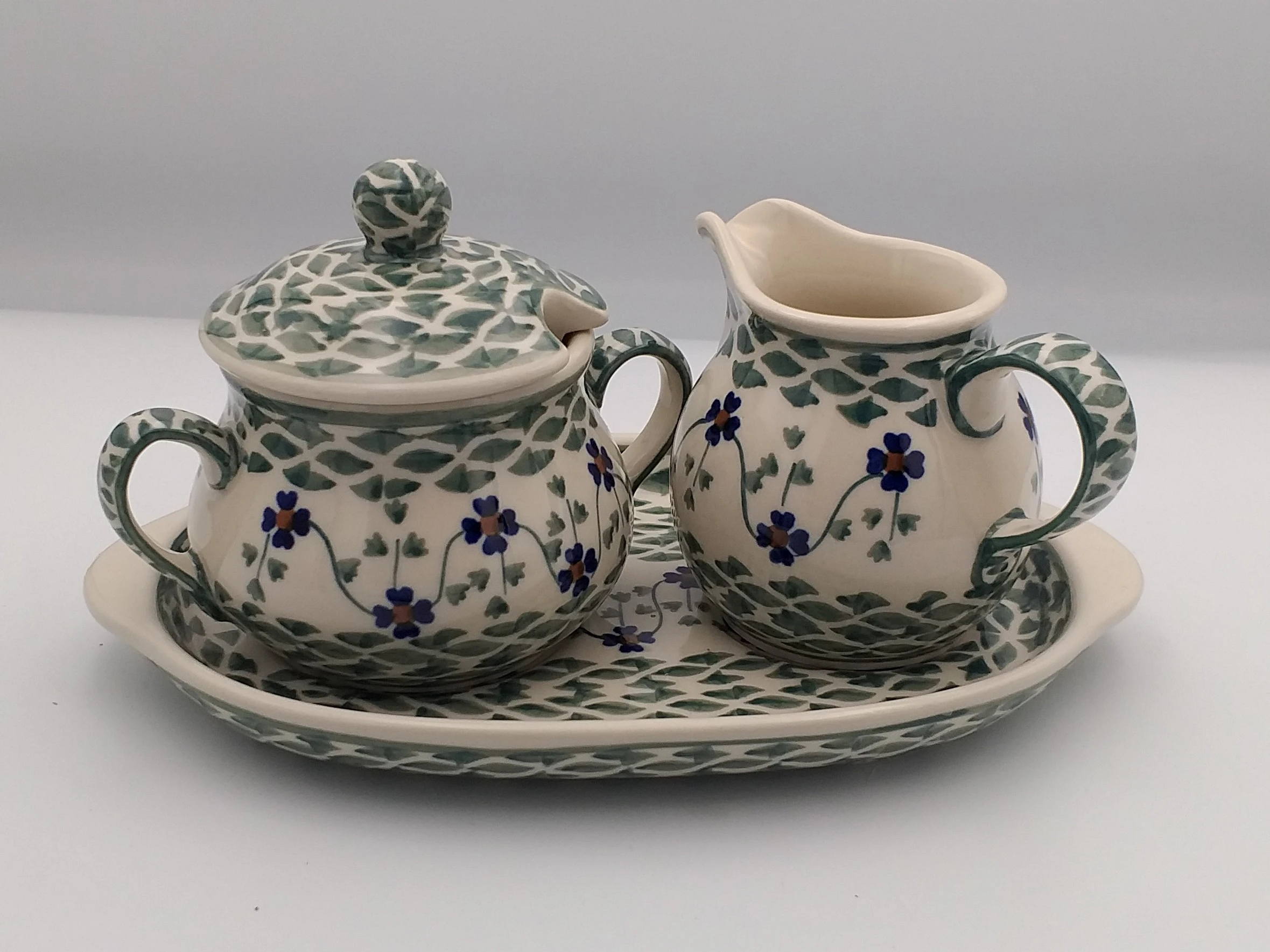 Zestaw Bolesławiec dzbanek na mleko i cukierniczka na tacce to praktyczny komplet do serwowania dodatków do kawy i herbaty.