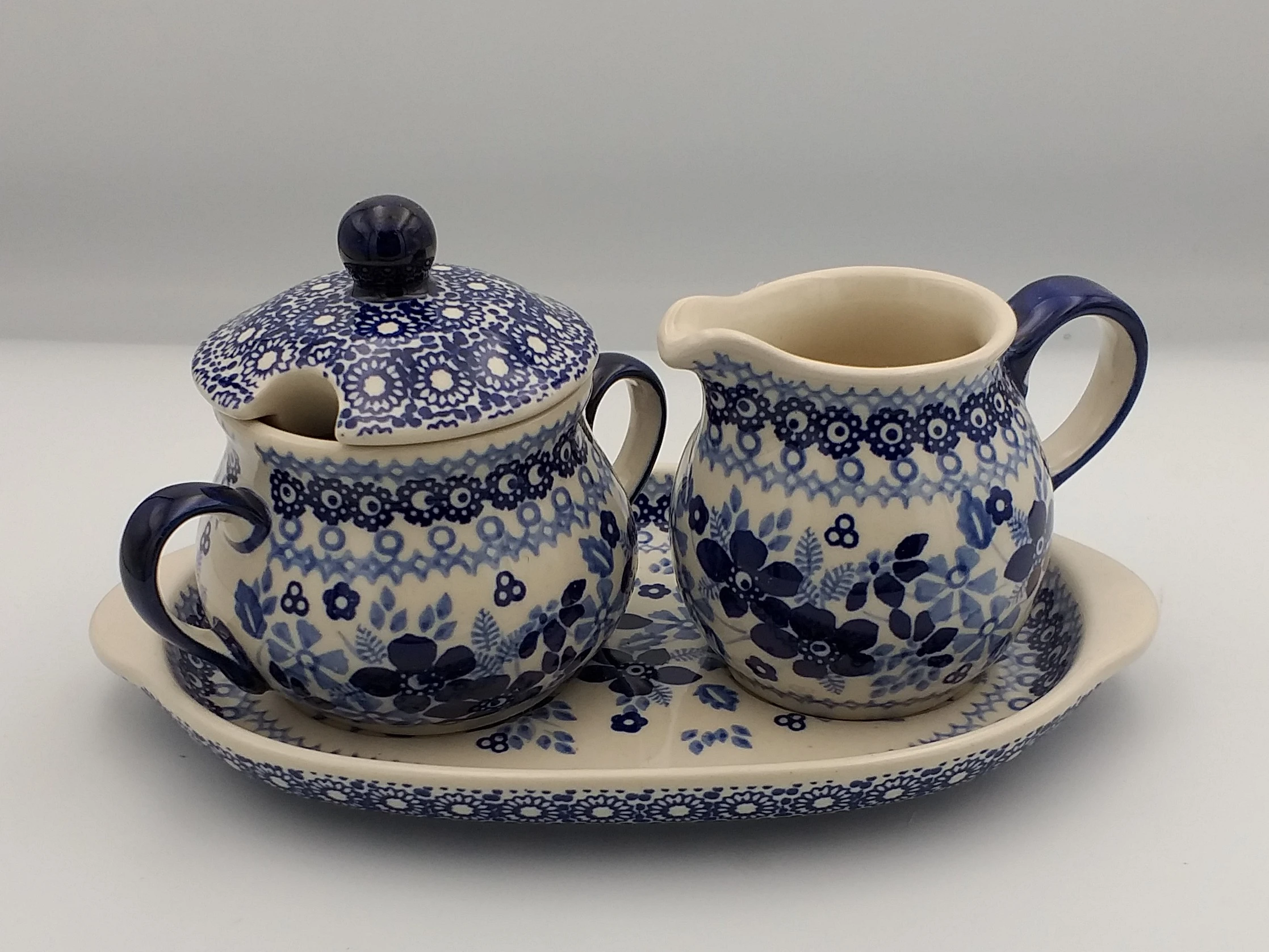 Zestaw Bolesławiec dzbanek na mleko i cukierniczka na tacce to praktyczny komplet do serwowania dodatków do kawy i herbaty.