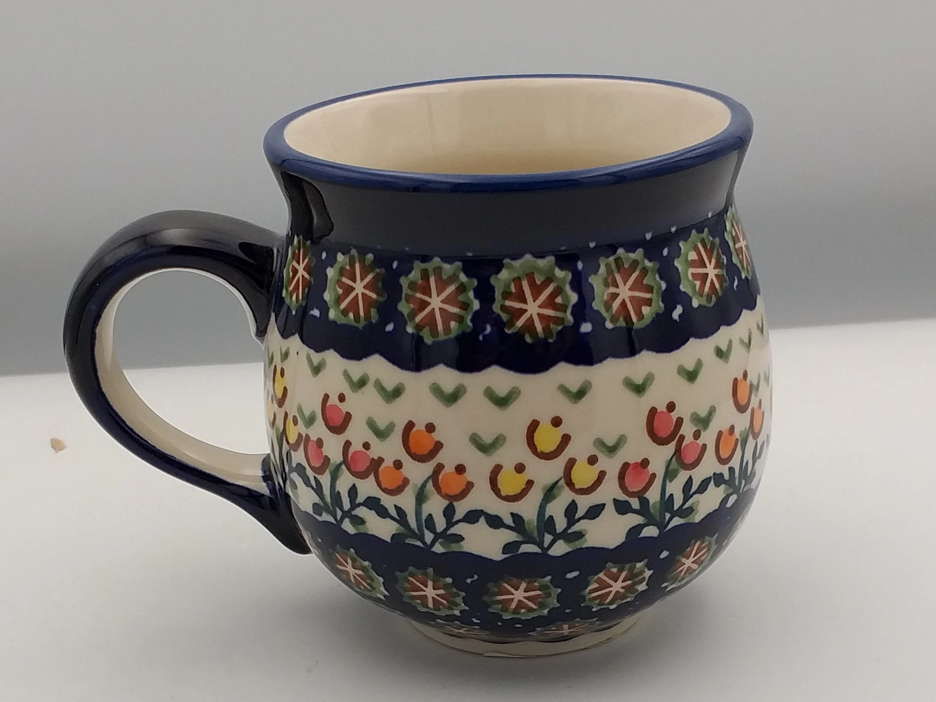 Kubek czeski 0,3l , ma niepowtarzalny kształt w którym każdy napój smakuje lepiej. Wygodne ucho sprawi że kubek będzie waszym ulubionym naczyniem na sok czy kompot. Rewelacyjnie sprawdzi się do serwowania grzanego wina, kawy czy herbaty. Wspaniale ozdobi każdy stół czy półkę w kuchni. Produkt w całości wykonany ręcznie, nadaje się do użytku w zmywarce, przystosowany do kontaktu z żywnością. Wymiary: Długość 12,1 cm Szerokość 8,8 cm Wysokość 9,2 cm Pojemność: 0,3 L.