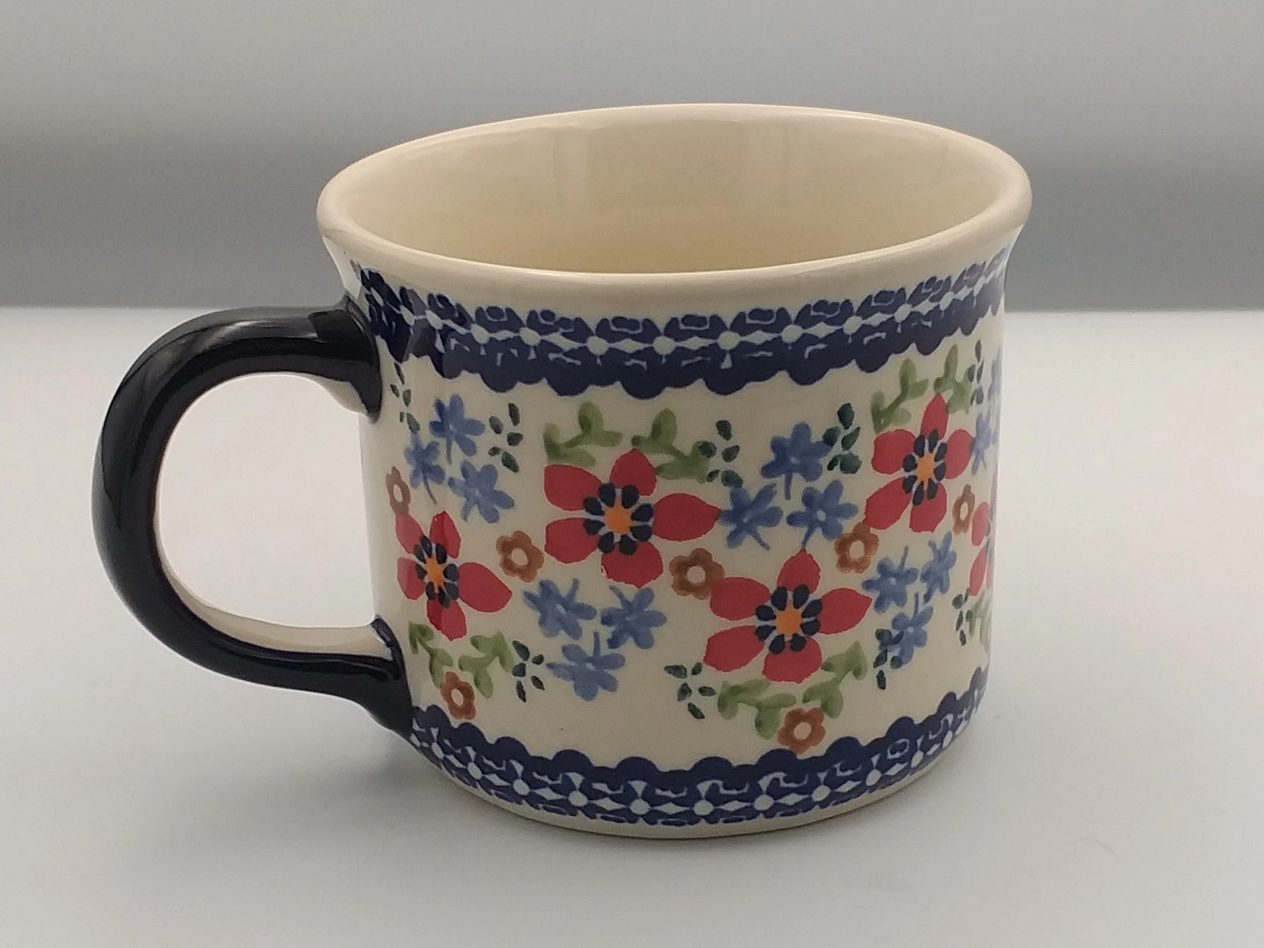 Dobrze wyprofilowany kształt sprawia, że kubek stabilnie leży w dłoni. Ceramika Bolesławiec długo utrzymuje temperaturę napoju i jest odporna na intensywne, codzienne użytkowanie.