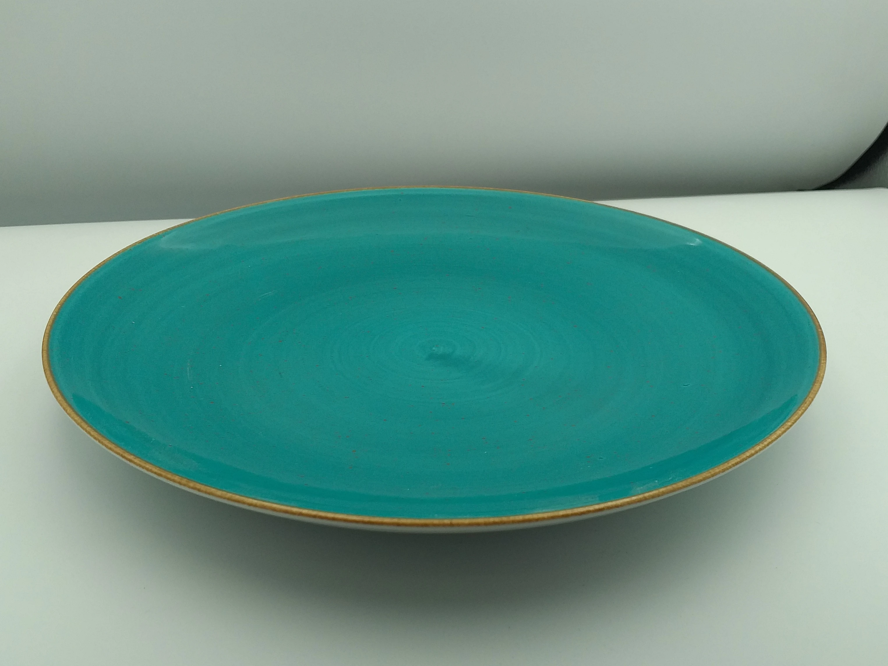 Ręcznie malowane wykończenie w kolorze morskim nadaje porcelanie charakterystyczny wygląd. Delikatne różnice w zdobieniu sprawiają, że każdy talerz jest unikalny.