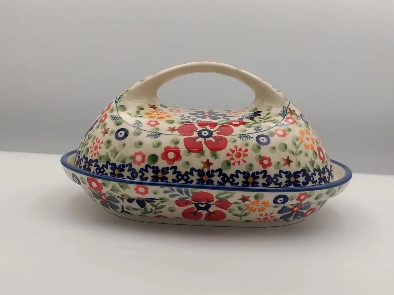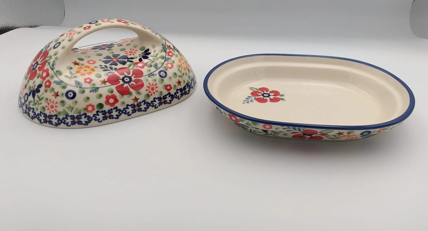 Maselnica mała z pokrywką. Zabezpiecza masło i inne produkty spożywcze przed wyschnięciem, przedłużając ich świeżość. Produkt w całości wykonywany ręcznie, będzie prezentował się wspaniale w każdym domu. Produkt sprawdzi się jako wspaniały upominek lub uzupełnienie kolekcji. Nadaje się do użytku w zmywarce, przystosowany do kontaktu z żywnością. Wymiary: Długość 17,7 cm Szerokość 13,2 cm Wysokość 9,5 cm.