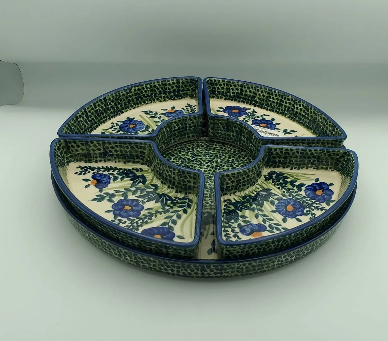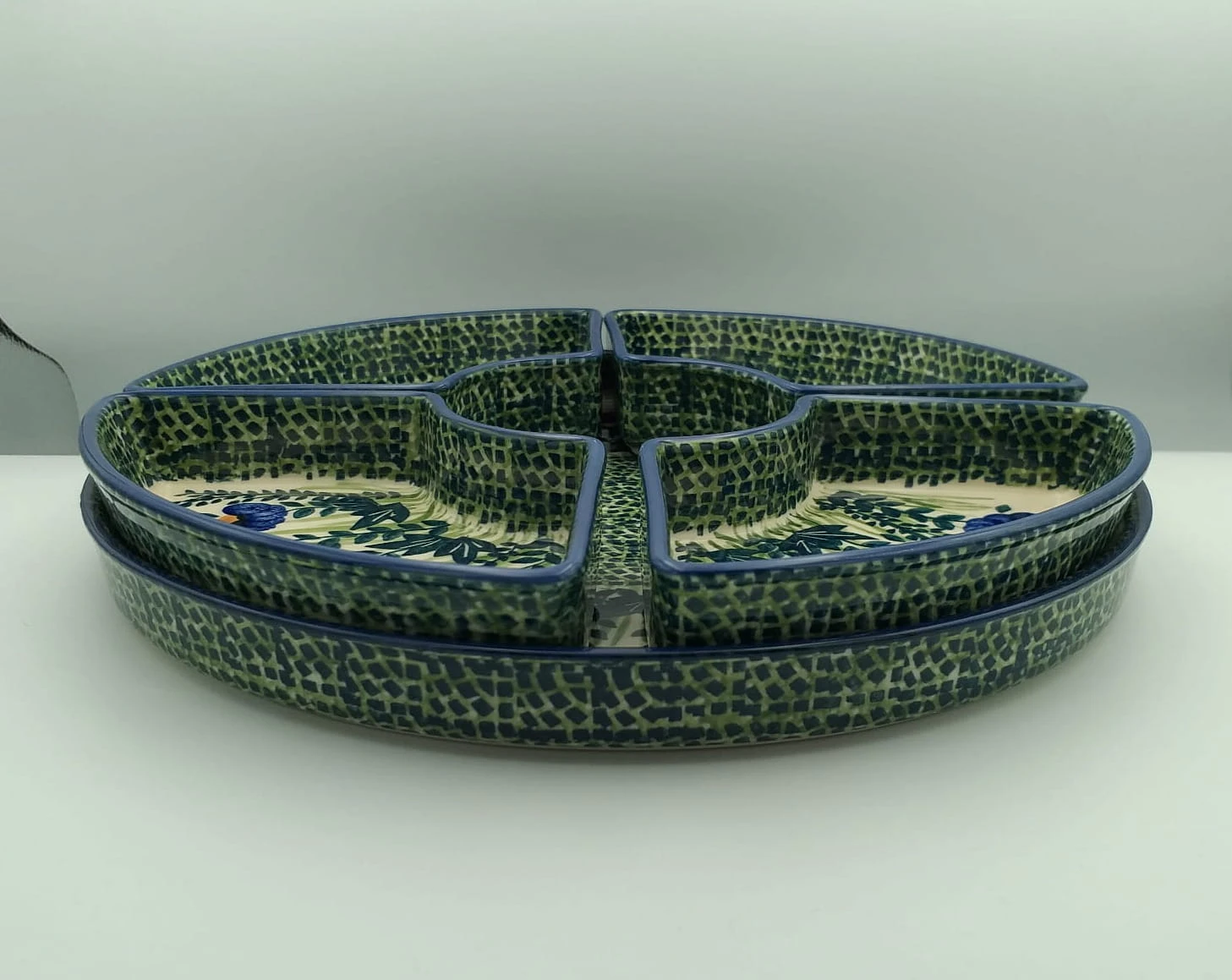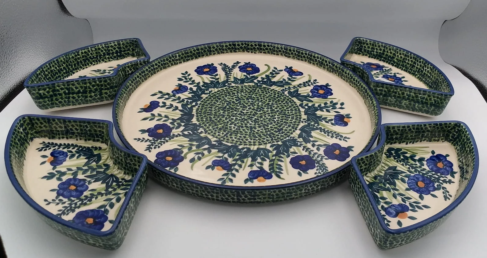 Naczynie do serwowania, składa się z tacy i czterech miseczek na przystawki. Idealnie sprawdzi się na każdym przyjęciu i będzie wspaniałą ozdoba każdego stołu. Produkt malowany ręcznie nadaje się do użytku w zmywarce, piekarniku i kuchence mikrofalowej.