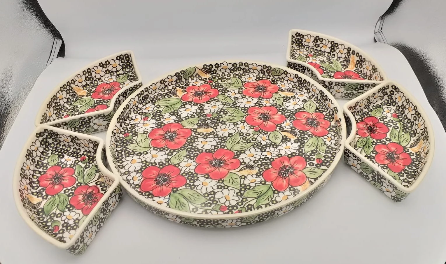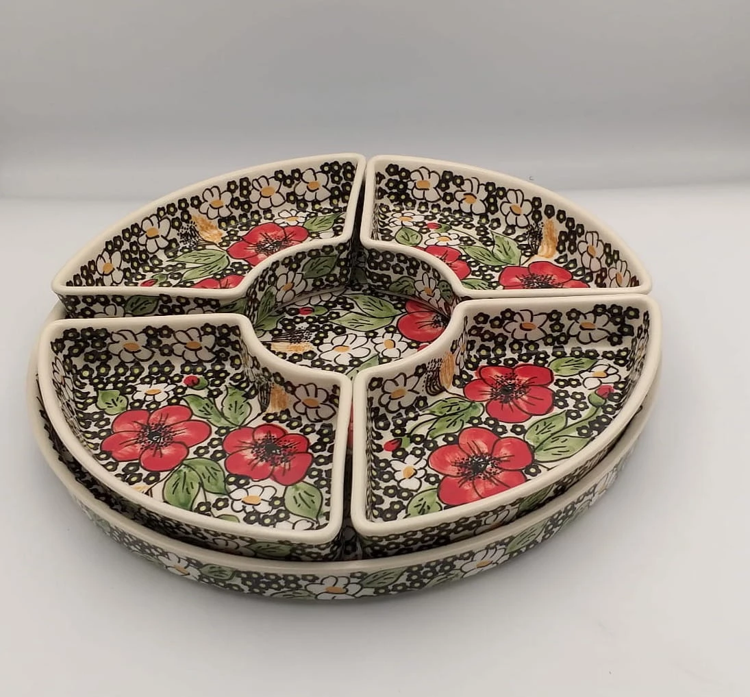 Naczynie do serwowania, składa się z tacy i czterech miseczek na przystawki. Idealnie sprawdzi się na każdym przyjęciu i będzie wspaniałą ozdoba każdego stołu. Produkt malowany ręcznie nadaje się do użytku w zmywarce, piekarniku i kuchence mikrofalowej.