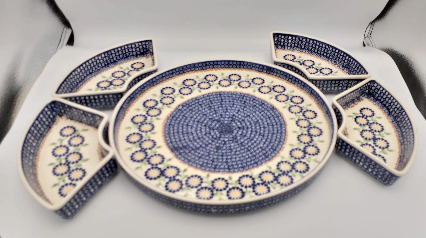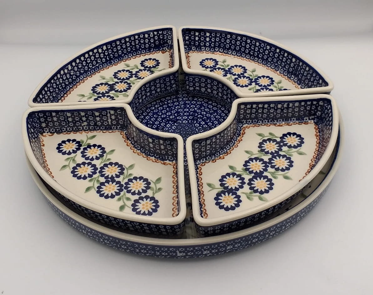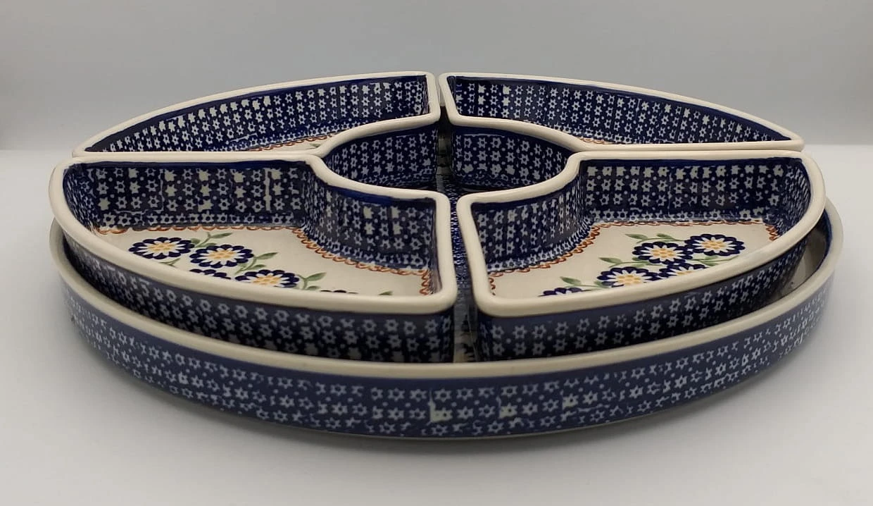 Naczynie do serwowania, składa się z tacy i czterech miseczek na przystawki. Idealnie sprawdzi się na każdym przyjęciu i będzie wspaniałą ozdoba każdego stołu. Produkt malowany ręcznie nadaje się do użytku w zmywarce, piekarniku i kuchence mikrofalowej.