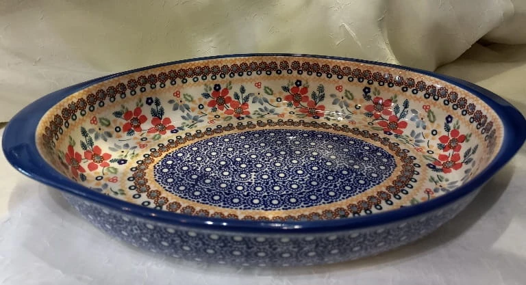 Półmisek idealny do serwowania oraz zapiekania różnych mięs, makaronów czy innych potraw. Sprawdzi się w każdej kuchni, naczynie będzie idealne dla miłośników form klasycznych jak i nowoczesnych. Wymiary: Długość 33,8cm Szerokość 22 cm Wysokość 5,4 cm.