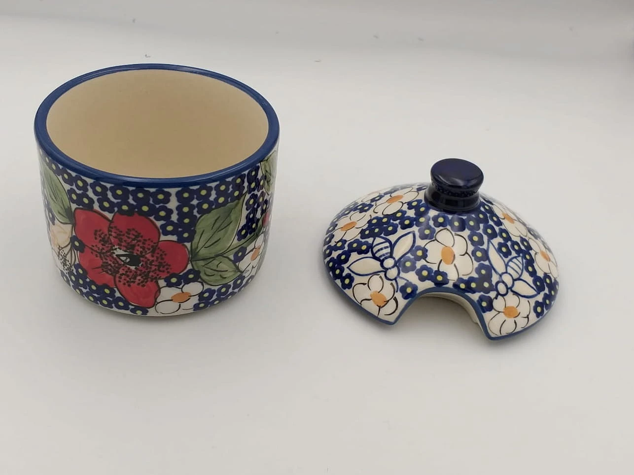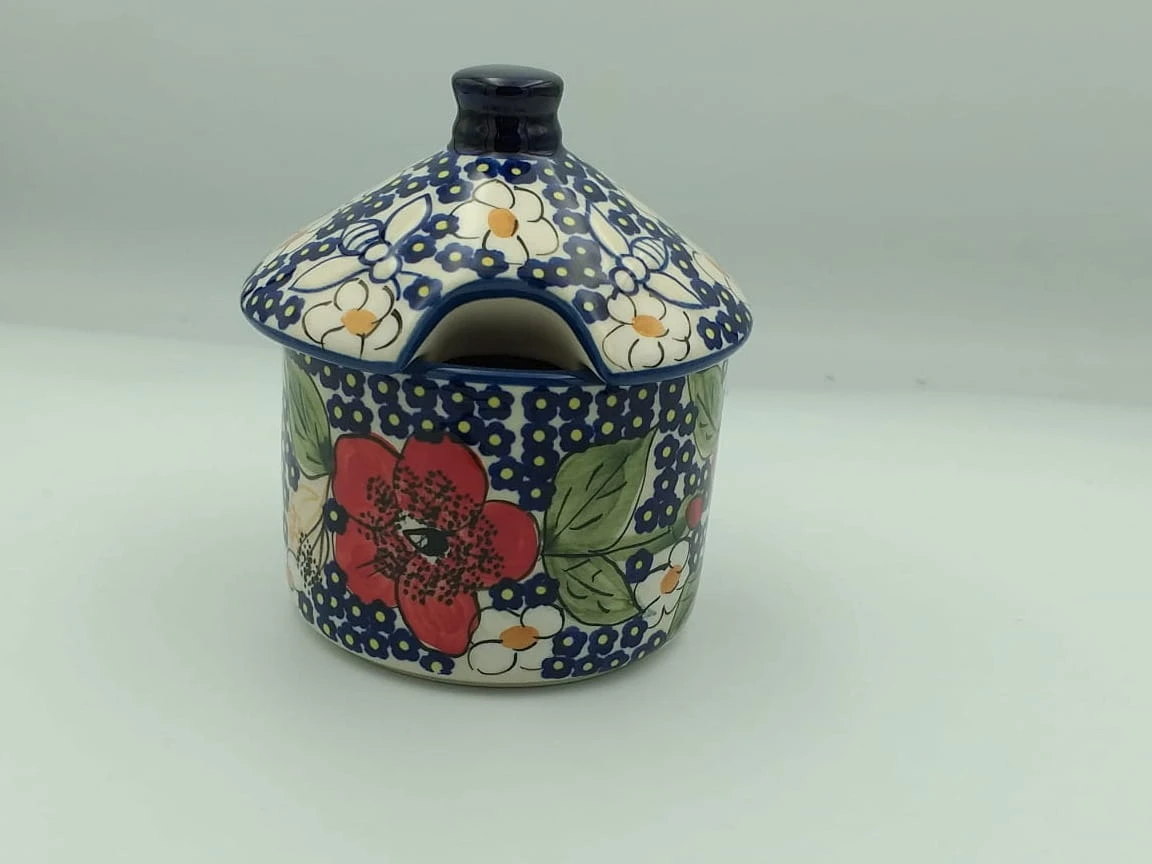 Dekorowany w stylu charakterystycznym dla ceramiki Bolesławieckiej, pojemnik to nie tylko praktyczne narzędzie kuchenne, ale także piękny element dekoracyjny, który dodaje uroku Twojej przestrzeni kuchennej.