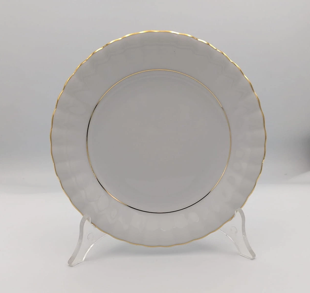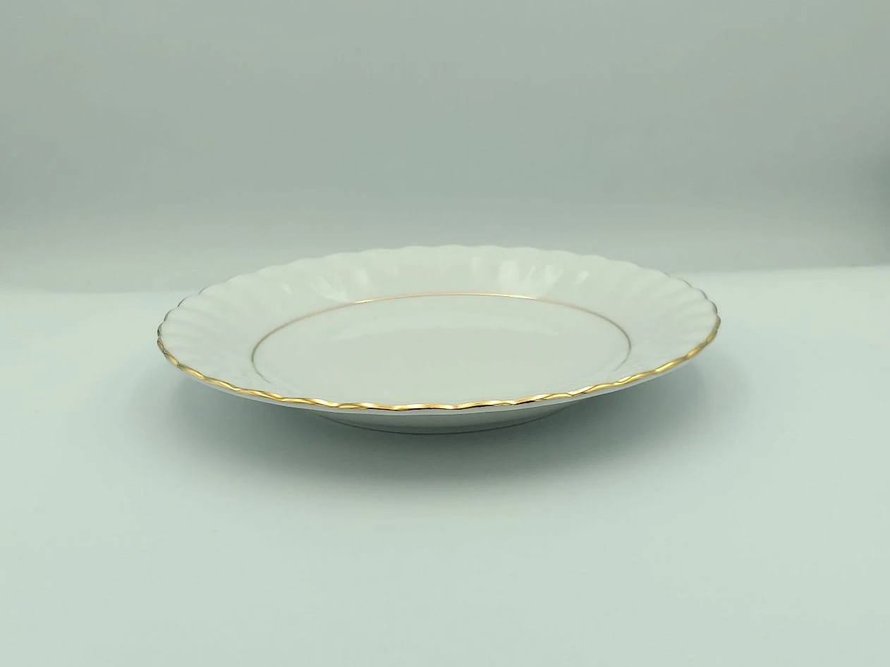 Talerzyk deserowy dekorowany złotym paskiem. Średnica: 17 cm