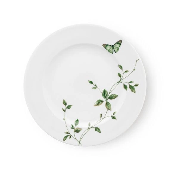 Margaret Magiczny Ogród to klasyczna biała porcelana ozdobiona subtelnymi ornamentami utrzymanymi w odcieniach zieleni z dodatkiem złota. Dekorację tworzy kwitnąca roślinność z połyskującymi, ręcznie malowanymi, złotymi akcentami oraz uroczy motyl, także upiększony tym kruszcem. Kolekcja przywodzi na myśl ciepłe, letnie poranki spędzone przy filiżance owocowej herbaty, wśród śpiewu ptaków i zapachu kwitnących drzew.