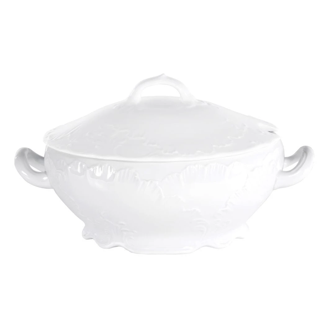 Waza porcelanowa Ćmielów Rococo Maria o pojemności 2,7 l to praktyczny element zastawy stołowej przeznaczony do serwowania zup i dań płynnych. Klasyczny fason Rococo Maria oraz biała dekoracja 0001 sprawiają, że pasuje do eleganckich i codziennych aranżacji stołu.