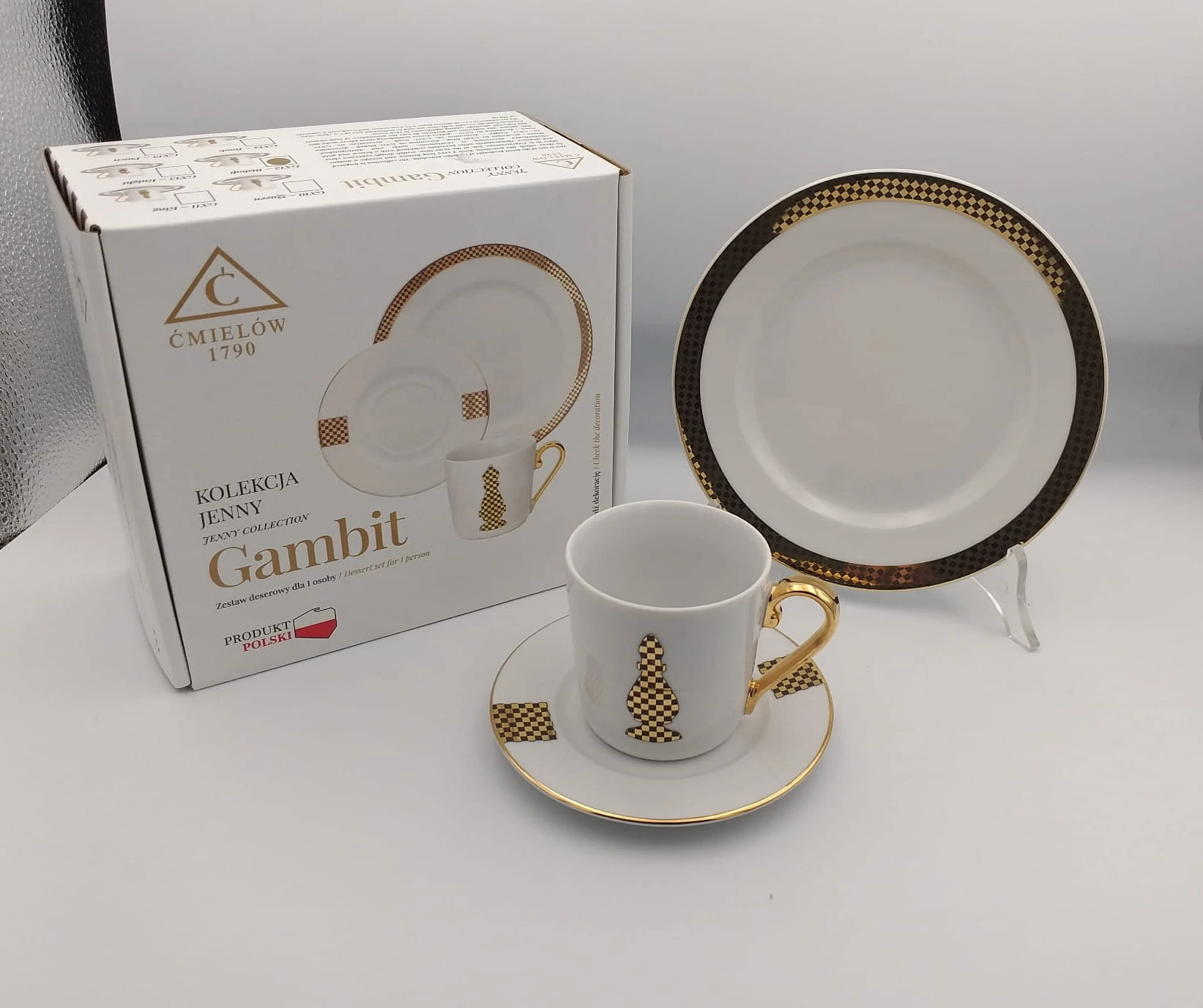 Więcej informacji Materiał Porcelana Marka Ćmielów Malowane Tak Kolekcja Jenny Produkt Zestawy do kawy Ilość osób 1 Dekoracja Tak Zmywarka Nie Mikrofala Nie Kolor Czarny, Złoty